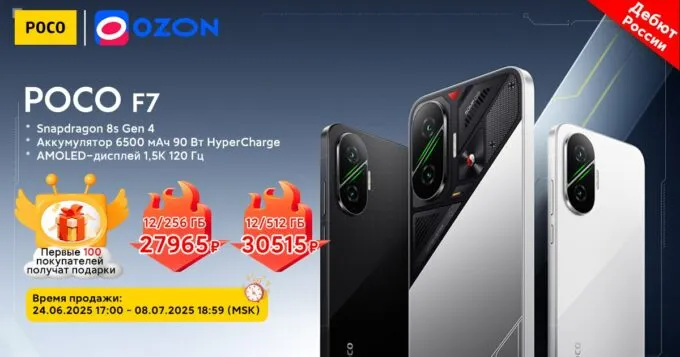 На старте продаж Xiaomi Poco F7 (12/256 Гбайт) будет стоить 27 965 рублей. Версия с 512 Гбайт обойдется в 30 515 рублей. Заказывать субфлагман нужно на Ozon, первые 100 покупателей получат наушники Redmi Buds 6 Play.