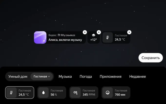Напомним, что Дуо Макс — колонка, которая имеет 10,5-дюймовый дисплей с разрешением Full HD, динамики 60 Вт, поддержку Zigbee 3.0. В Яндексе разрешили настраивать главный экран под себя — можно выбирать стиль часов, фоновые заставки, добавлять виджеты. Например, на дисплей можно поставить данные с датчиков умного дома и шорткаты для быстрого запуска.