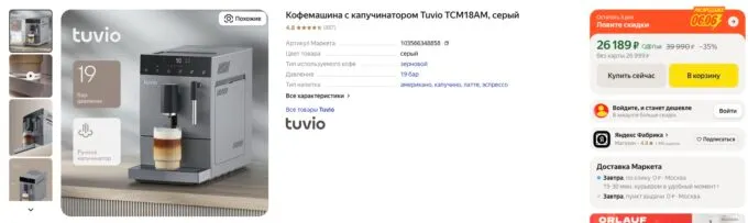 Коротко: автоматические кофемашины Tuvio TCM18AM и Tuvio TCM19AA можно урвать на Яндекс Маркете за 26 189 и 27 739 рублей.