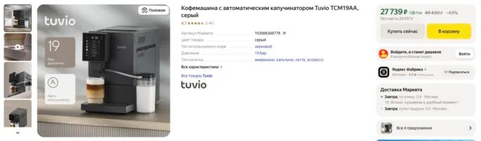 Наверняка многие любители кофе уже заметили, что со временем эта привычка обходится всё дороже. Особенно если с утра хватать эспрессо, днём выпивать латте в кофейне, а завершать день третьим стаканчиком по дороге домой. В результате за месяц спокойно можно потратить несколько тысяч. Согласитесь, проще и выгоднее один раз вложиться в нормальную кофемашину. Тем более, сейчас такие аппараты стоят адекватных денег. Например, у суббренда Яндекса, Tuvio, есть собственная линейка кофемашин с капучинатором, кофемолкой и другими фишками. Сейчас их можно урвать со скидками.