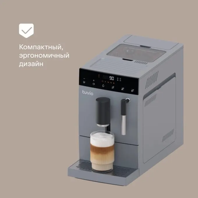 Tuvio TCM19AA — ещё одна автоматическая кофемашина, но уже с огромным сенсорным экраном. Девайс больше выглядит как дорогой гаджет из шоурума люксовых автомобилей. При этом он получился довольно практичным: матовый корпус не бликует, не собирает отпечатки и царапины, а габариты позволяют поставить машину даже на небольшую столешницу. Главное отличие этой модели — большой сенсорный экран, через который удобно управлять всеми функциями. Интерфейс здесь максимально дружелюбный: можно выбрать тип напитка, настроить крепость, объём, температуру, степень помола и даже предварительное смачивание. Самый профессиональный подход к кофеварению в домашних условиях.