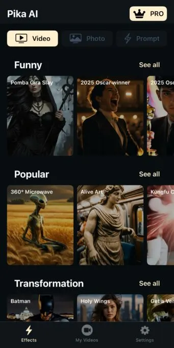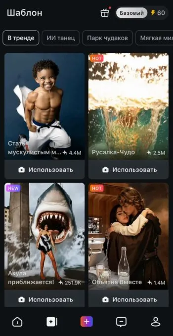 Pixverse – самая трендовая нейронка на данный момент. В нашу подборку она залетает благодаря ежедневному обновлению кредитов, что позволяет бесплатно применять вау-эффекты к видео прямо в приложении: достаточно загрузить одну фотку, чтобы человек на картинке отрастил крылья, обнялся с тигром или превратился в Халка. Если вы уже представили в голове корявые анимации, пора об этом забыть. Большинство эффектов выглядит предельно реалистично и качественно. При этом приложение не перегружено всяким мусором: есть шаблон, есть кнопка «применить». Все, что требуется – закинуть подходящую фотку. Ни единого промпта.