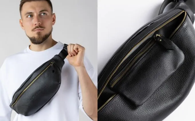 Теперь обратите внимание на мужскую черную сумку от бренда Kostaskin, который специализируется на изделиях из натуральной кожи. Перед вами большая поясная сумка размером 40x12x18. Тут вам и дополнительный карман, и плотный тканевый ремень, и металлическая застежка-молния. Поместится все необходимое!