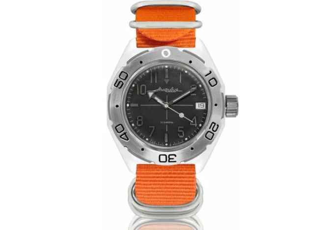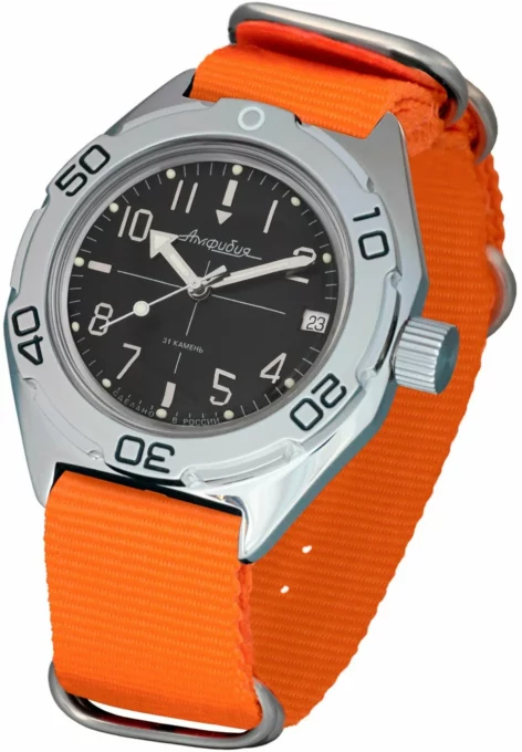 Российская механика с дайверскими функциями и ярким ремешком. Модель Амфибия 670921 Orange получила культовый корпус из нержавеющей стали, узнаваемый чёрный циферблат и стрелки, покрытые флуоресцентной краской. Всё это защищено органическим стеклом, устойчивым к перепадам давления.