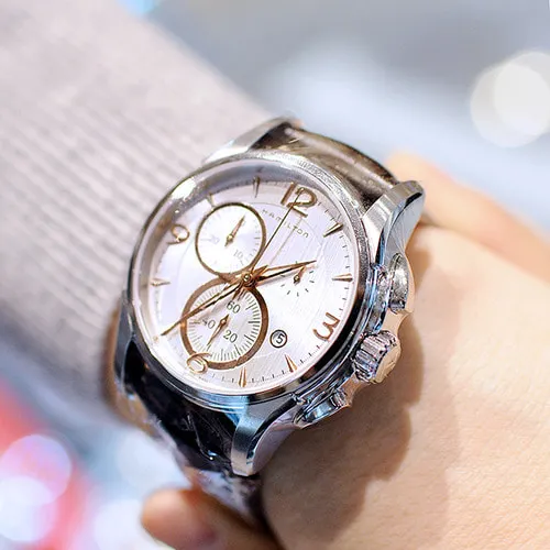 За точность Hamilton JazzMaster H32612555 отвечает надёжный кварцевый механизм с минимальной погрешностью — до 20 секунд в месяц. Сапфировое стекло защищает циферблат от царапин и делает модель устойчивой к повседневному износу. Разумеется, все базовые фичи хронографов тут тоже на борту. Hamilton JazzMaster H32612555 подойдут и для офиса, и для активного отдыха.