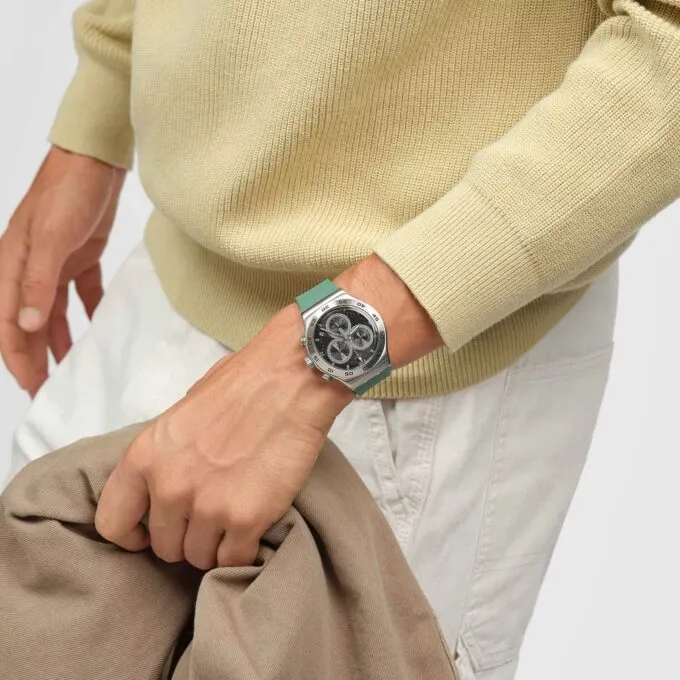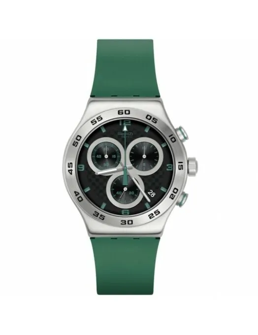 Яркий карбоновый хронограф от Swatch точно никто не ждал. Модель YVS525 — одна из самых ярких вариаций линейки Irony. Эти часы предлагают корпус из нержавеющей стали, который объединяет в себе спортивный дух с городским стилем. Особое внимание привлекает чёрный циферблат с текстурой под карбон и ярко-зелёным принтом, а матовый стальной корпус эффектно контрастирует с каучуковым ремешком насыщенного зелёного цвета. Такое сочетание делает модель визуально динамичной и выделяющейся.
