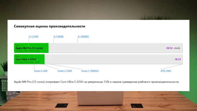 Комп работает на процессоре Intel Core Ultra 9 285H. По мощности чип сопоставим с Apple M4 Pro на 12 ядер. Версия послабее получила процессор Core Ultra 5 225H. В свою очередь, этот процессор немного слабее упомянутого выше Apple M4 Pro. Дискретная видеокарта отсутствует, но есть неплохая встроенная графика, хотя для требовательных игр этот девайс не подойдет.