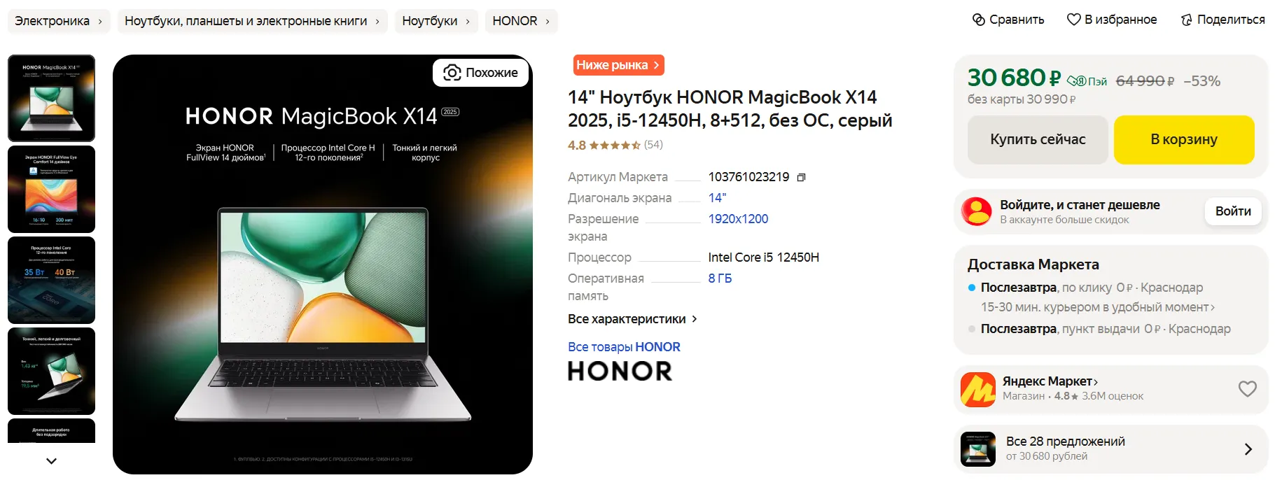 Бинго для тех, кто относится к последнему типу и при этом не хочет тратить кучу денег на покупку нового ноута: Honor MagicBook X14 (2025). Сейчас за эту модель просят всего 30 990 рублей на Маркете.