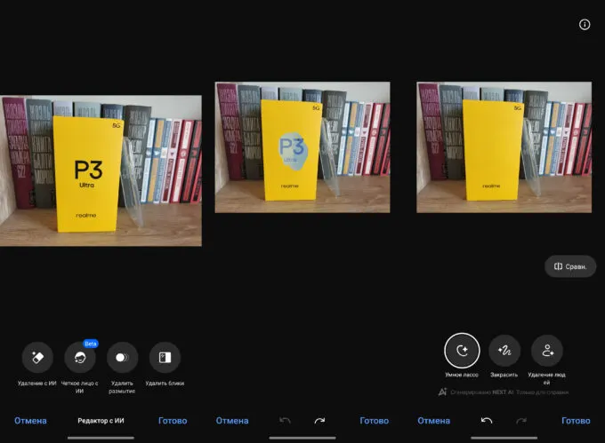 С другой стороны, тут всё-таки попытались выжать максимум из возможного. Видео можно снимать в 4K@60FPS, есть оптическая стабилизация и множество настроек в стоковом приложении камеры. Особенно выделяется встроенный ИИ-редактор фотографий. Можно удалить с фото лишние объекты (в том числе людей), размытие и блики, а также сделать лицо более чётким. Мало того, что это просто работает, так ещё и работает быстро — просто респект.
