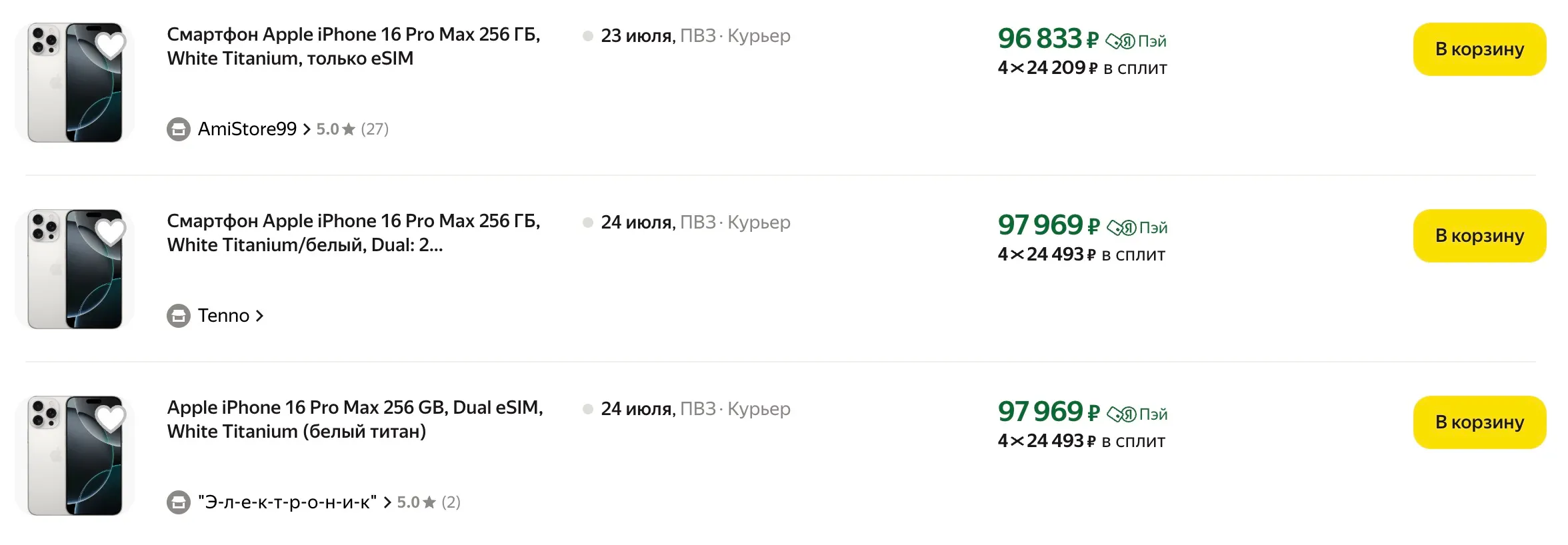 Сейчас iPhone 16 Pro Max можно найти за 96 800 рублей — очень хороший прайс. Напомним, что речь идет о девайсе с увеличенным до 256 Гбайт накопителем (версий 128 Гбайт нет в природе).