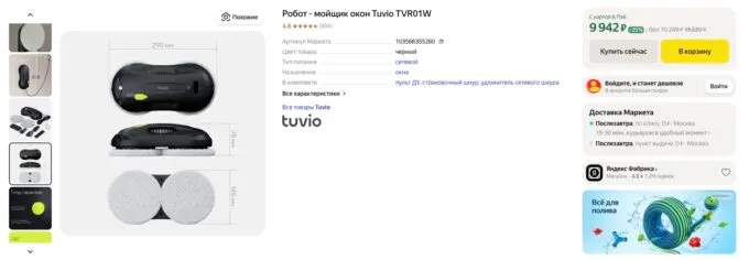 Сейчас топовый робот-мойщик окон Tuvio TVR01W продаётся на Яндекс Маркете за 9942 рубля. А с кэшбеками некоторых банков он обойдётся ещё дешевле.