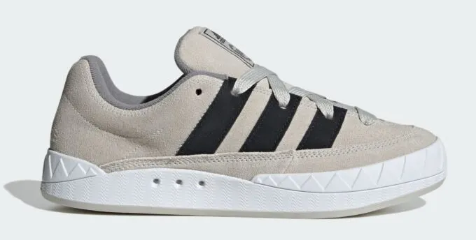 Завершаем подборку с помощью серо-черных Adimatic. Это культовые кроссовки с верхом из натуральной замши, широкими шнурками и зигзагообразной ЭВА-межподошвой. На боковых частях айтема расположились уже знакомые нам три полоски adidas – тоже, кстати, более широкие, чем обычно.