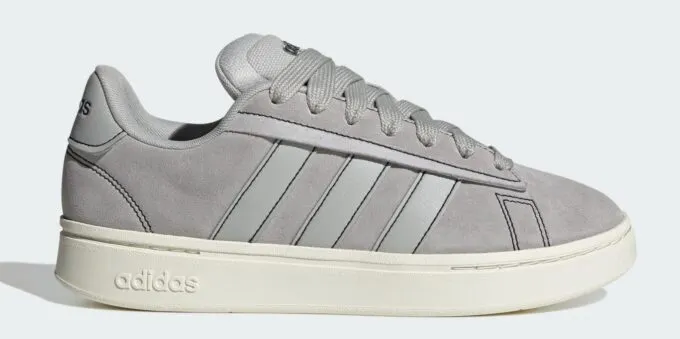 Начнем с кедов. Перед вами серые Grand Court Alpha – классическая модель, которой все-таки есть чем удивить. Тут вам и массивная подошва, и широкие шнурки, и, например, амортизирующая межподошва CloudFoam, отвечающая за комфорт во время ходьбы. Если ищете кеды с неброским дизайном, это хороший выбор.