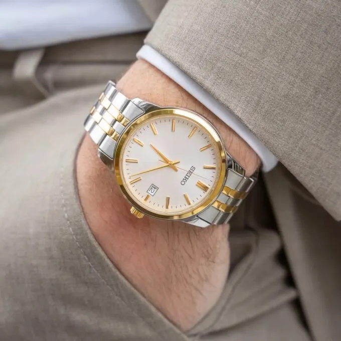 Сразу отметим, что в фильме 2000 года Бейтман носил винтажную модель Seiko 5 SNXJ90k1, которую уже давно сняли с продажи. В 90-х это был доступный аналог премиальных Rolex Datejust. Ну, а мы поискали максимально схожую и не слишком дорогую модель.