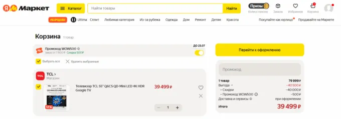 Что по прайсу? Сейчас TCL 55Q6CS висит на Яндекс.Маркете всего от 39 499 рублей по промокоду WOW500. Стоит отметить, что цена указана для Москвы — жителям других городов нужно переключиться на столицу и проверить, можно ли оформить доставку.