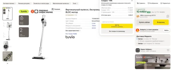 Прямо сейчас топовый пылесос Tuvio TS02HBHW можно приобрести на Яндекс Маркете со скидкой всего за 9694 рубля по промокоду DET10. Также не забывайте, что многие банки готовы отсыпать щедрый кэшбек за покупки на этой платформе.