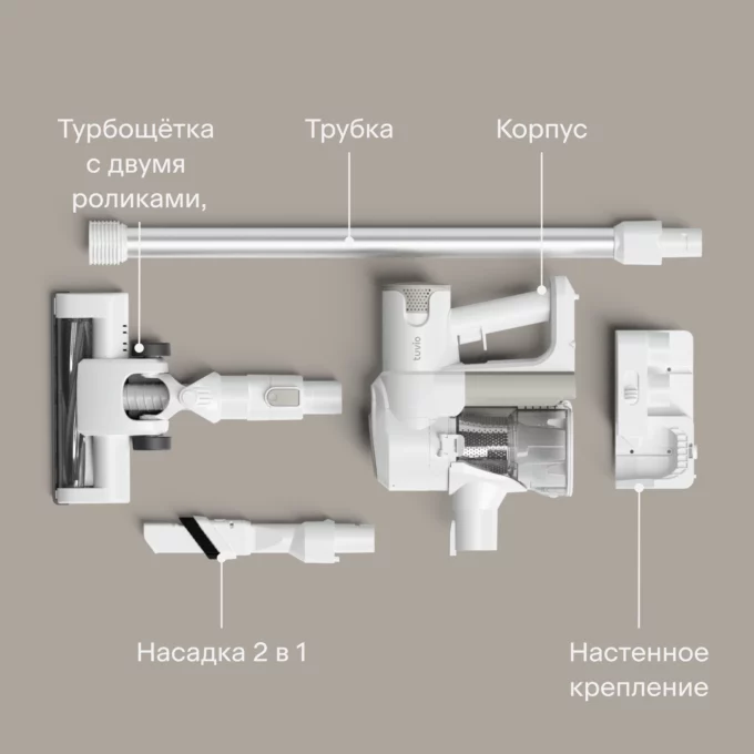 Пылесос Tuvio TS02HBHW сразу цепляет внешним видом. Это не просто бытовой девайс, а по-настоящему эффектный аксессуар для дома. Корпус тут довольно футуристичный. Дизайн отсылает к технике Dyson, но с собственным почерком. Такое устройство точно не придётся прятать в шкаф. Под обтекаемым каркасом скрывается мощный BLDC-мотор, роликовая щётка и двухступенчатая система HEPA-фильтрации, которая не даст пыли и аллергенам разлететься по комнате.