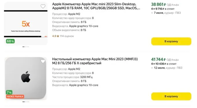 • Mac mini M2 (8/256 Гбайт) — 39 000 рублей. Прошлый месяц — 47 500 рублей