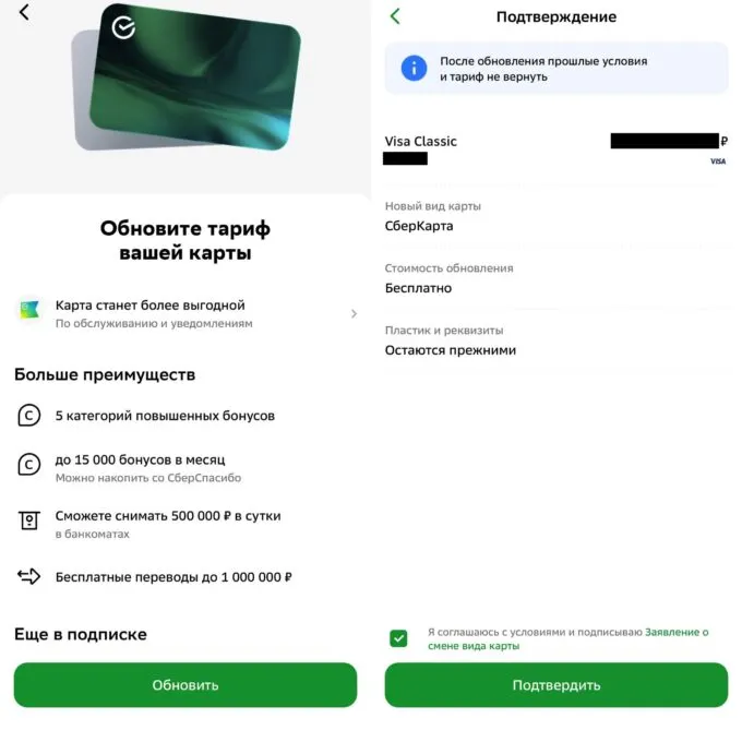 Чтобы перейти на новые условия, нужно открыть приложение Сбера, выбрать вашу дебетовую карту и нажать на кнопку «Обновить тариф вашей карты».