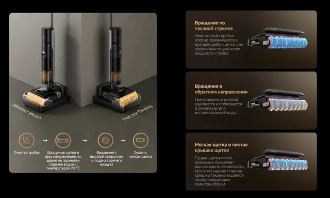 Топовый аппарат поддерживает влажную уборку. Чистая вода (это важно) постоянно подается из резервуара на термостойкую щетку. Эластичный скребок на щетке буквально разрезает волосы людей и животных, предотвращая наматывание. Также H12 FlexReach может автоматически подстраивать мощность в зависимости от загрязнения. Но можно выбрать один из нескольких режимов.