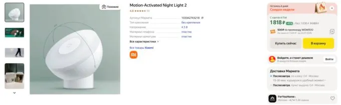 Прямо сейчас лучший ночник Xiaomi Motion-Activated Night Light 2 на Яндекс Маркете можно купить за 1818 рублей, а с кэшбеком некоторых банков он обойдётся в ~1,5 тысячи рублей.