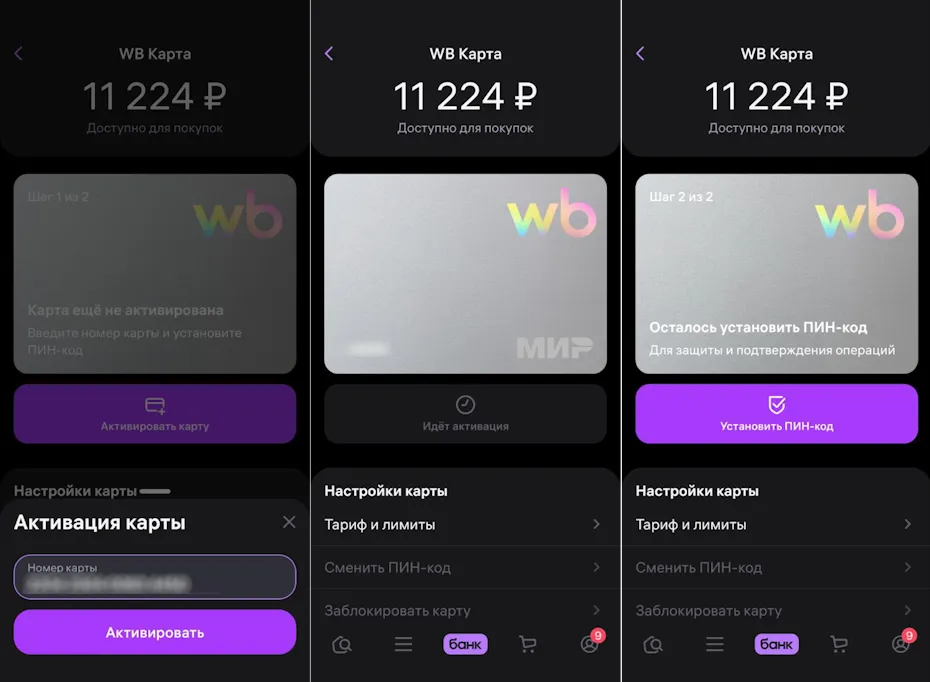 Выпуск карты и обслуживание бесплатное. После заказа карту можно забрать в любом ПВЗ Wildberries и там же установить ПИН-код. Карта привязывается к вашему счету в WB — с него можно оплачивать покупки на маркетплейсе, также счет удобно пополнять через CБП.