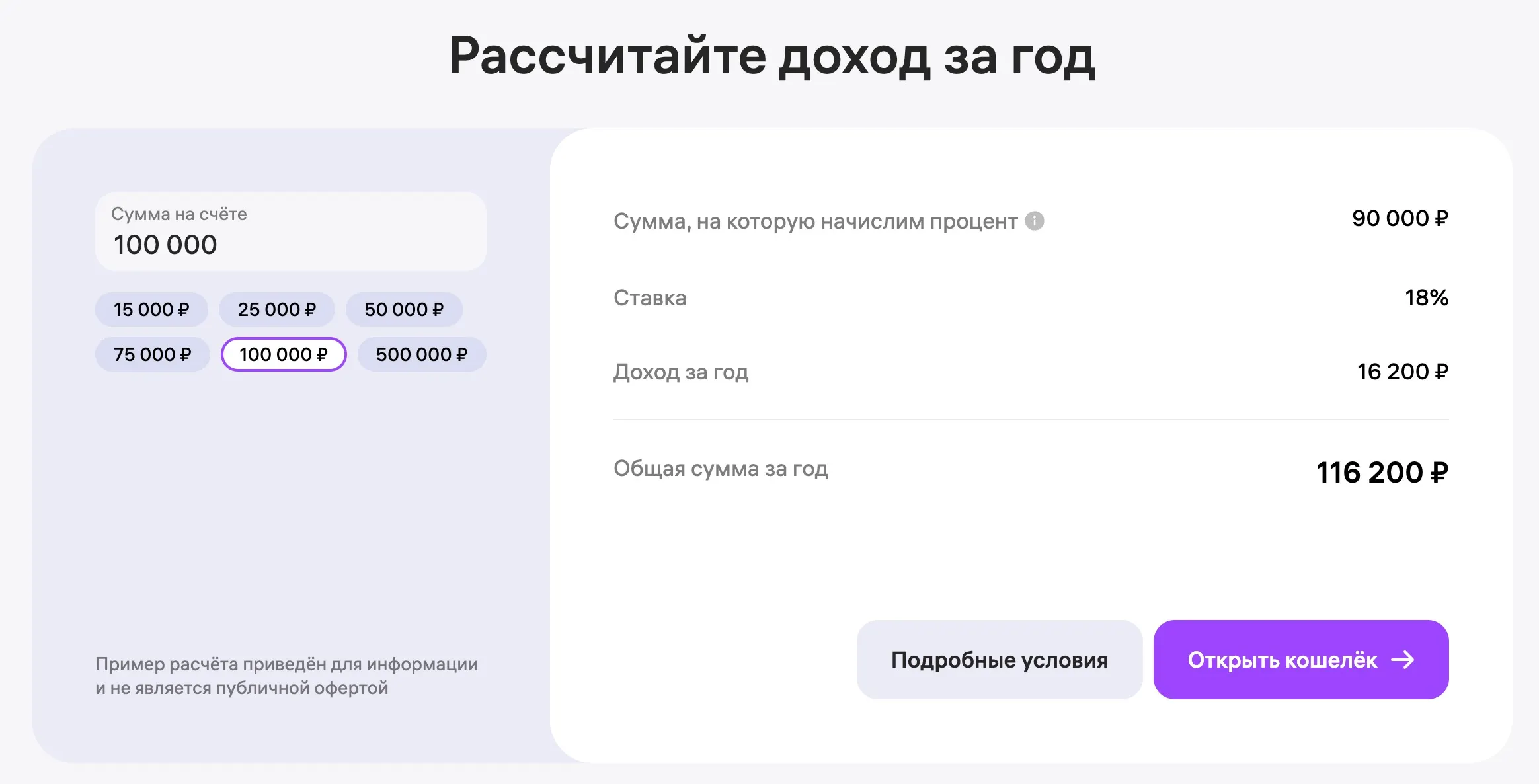 Пожалуй, главная вау-фишка дебетовой карты — 18% на остаток в кошельке. Предположим, у вас на счете будут в течение года лежать минимум 100 тысяч рублей, то с 90 тысяч вам накапает 16,2 тысячи рублей.