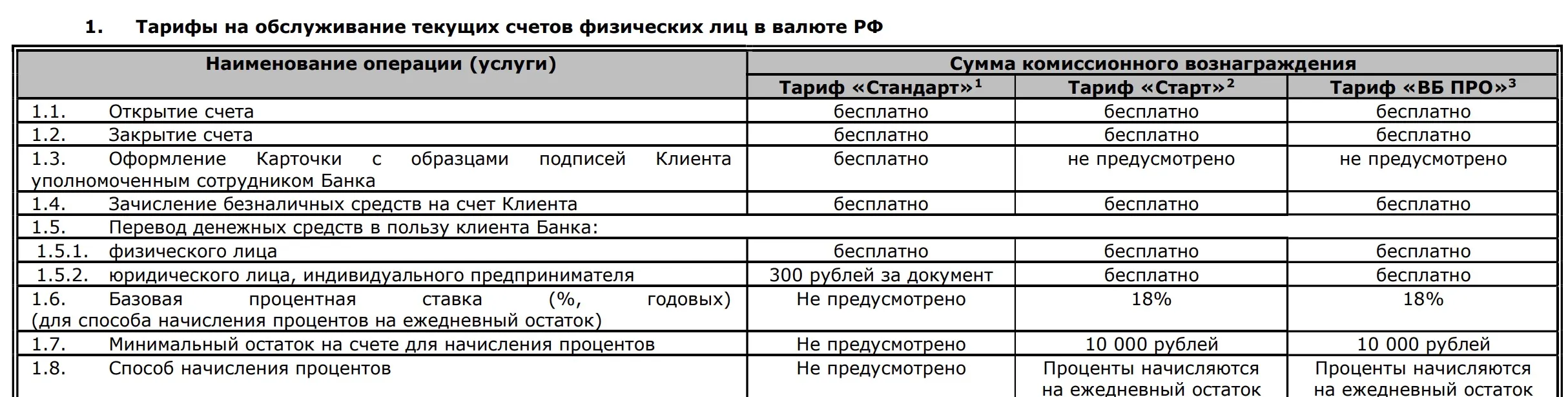 Есть три тарифа — Стандарт, Старт и ВБ ПРО. Отличий между ними мало (можно почитать в договоре), но на первом нет начисления процентов на остаток, а последним могут пользоваться только сотрудники Wildberries.