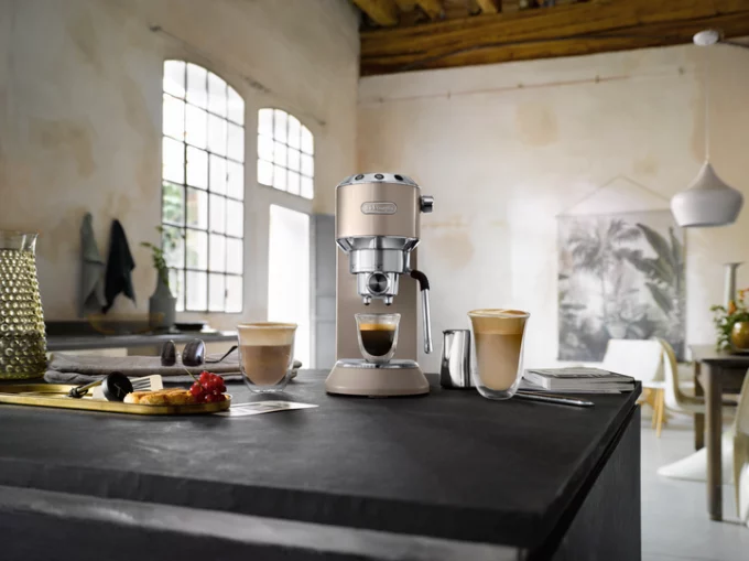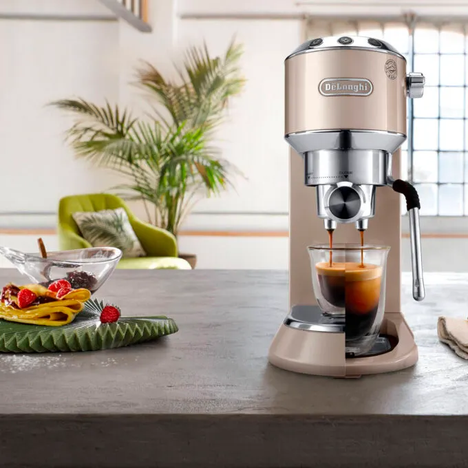 DeLonghi Dedica Arte EC885 BG — одна из самых компактных рожковых кофеварок на рынке. При ширине всего 15 см она без труда помещается даже на загруженной кухне. При этом корпус из матового металла с хромированными элементами выглядит премиально, а не дёшево. Управление максимально интуитивное, а все кнопки подсвечиваются. Несмотря на габариты, кофеварка оборудована полноценной панелью подогрева чашек и профессиональным холдером с двумя фильтрами.