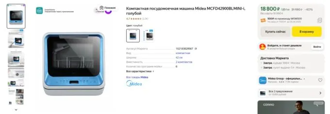 Прямо сейчас на Яндекс Маркете компактную посудомоечную машину Midea MCFD42900GMINI-i можно купить всего за 18 800 рублей. Также не забывайте, что многие банки предлагают кэшбек за покупки на этой платформе.