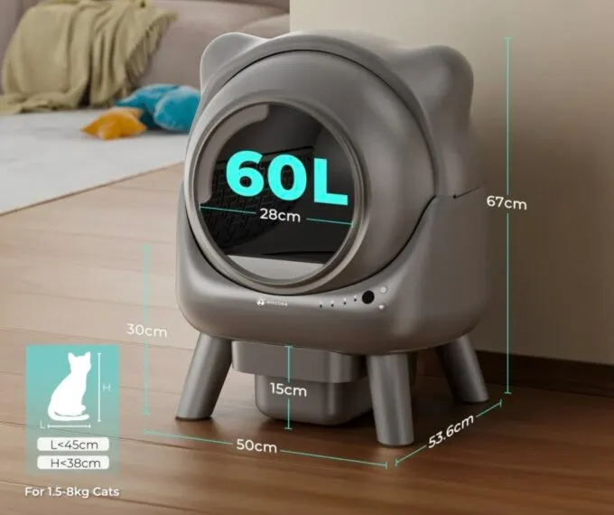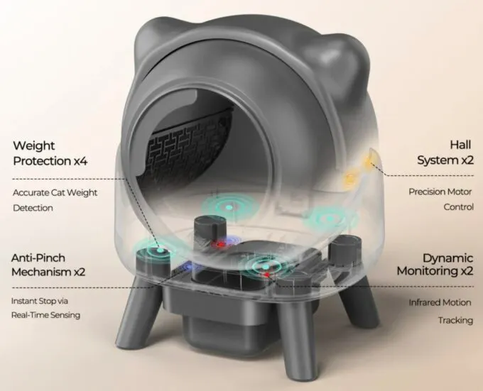 У Cura X1 очень много датчиков — 2 ИК-сенсора, 2 датчика Холла, весы и система защита от защемления. С ними устройство понимает, когда внутри находится питомец — оно не запустит процесс очистки, пока лоток занят. У гаджета широкий вход (рассчитано на животных весом до 8 кг) и высокие бортики — с ними наполнитель не высыпется, пока животное будет копаться.
