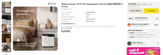 Сезон жары, пыли и сухого воздуха — отличное время, чтобы задуматься о здоровье и комфорте. Особенно если вы живёте в городе или страдаете от аллергии. Сейчас такие проблемы сегодня решаются покупкой недорогого гаджета – например, у Яндекса есть стильная мойка воздуха Tuvio TAP01DE. Девайс решает сразу несколько проблем: увлажняет, очищает и освежает воздух в помещении. Причём он работает почти бесшумно, подключается к Алисе и управляется через смартфон. Стоит копейки, а по возможностям не уступает очистителю Dyson за 60 тысяч рублей.