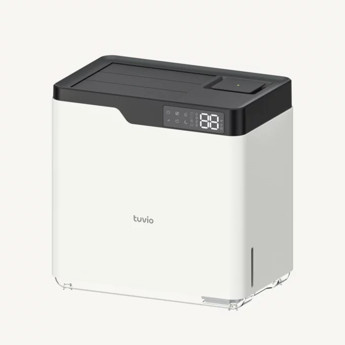На первый взгляд Tuvio TAP01DE напоминает миниатюрную хлебопечку, но внутри скрыт продвинутый увлажнитель с функцией очистки воздуха. Верхняя чёрная панель с экраном и сенсорным управлением контрастирует с белым матовым основанием, придавая гаджету футуристичный дизайн. Благодаря этому он не будет выбиваться из интерьера спальни, гостиной или детской. Ёмкость резервуара составляет 6 литров, а расход — до 650 мл в час. Так что его с головой хватит даже для больших помещений.