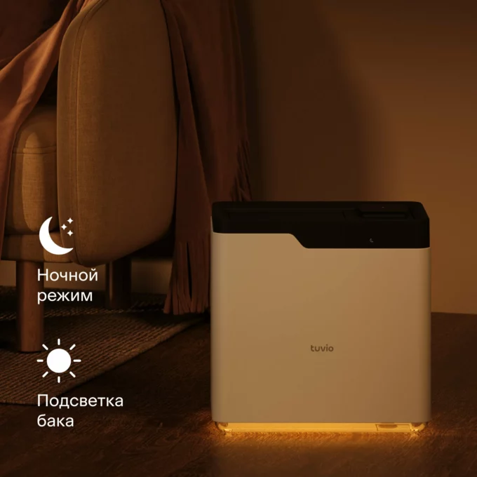 Ещё одна имбовая фича Tuvio TAP01DE — подключение к Wi-Fi и совместимость с Алисой. Можно управлять девайсом через приложение или голосом. Также в этой модели предусмотрен автоматический режим с поддержанием влажности от 40% до 80%, мягкая подсветка, которую можно использовать как ночник, и функция ароматерапии с отсеком под эфирные масла. Если коротко, Tuvio TAP01DE — не просто увлажнитель, а полноценное устройство для создания комфортной атмосферы дома.