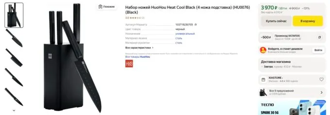 Сейчас на Яндекс Маркете шикарный набор кухонных ножей Xiaomi HuoHou Kitchen Knife Set можно купить всего за 3970 рублей, а с кэшбеком некоторых банков он обойдётся ещё дешевле.