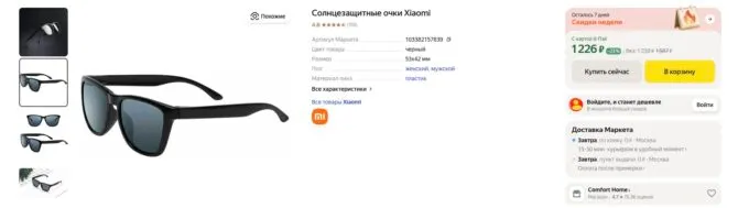 Сейчас на Яндекс Маркете фирменные очки Xiaomi Mijia Classic Square Sunglasses можно купить всего за 1226 рублей. А с кэшбеками некоторых банков они обойдутся ещё дешевле.