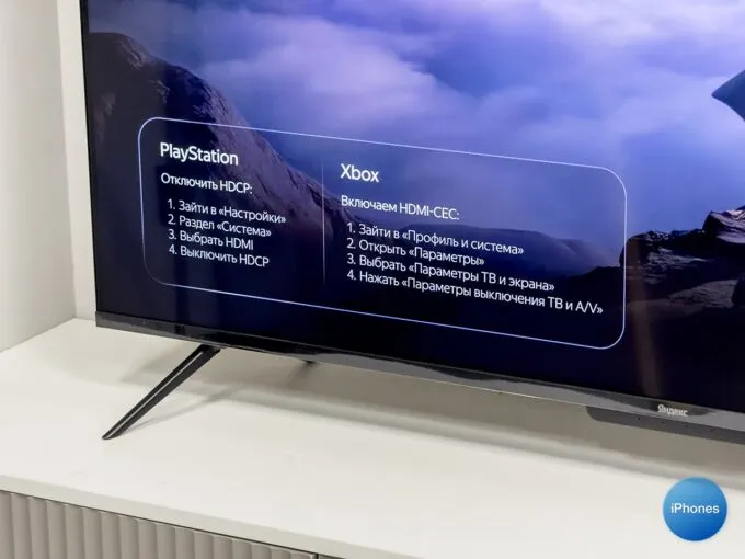 Такой аппарат пригодится для гейминга — экран поддерживает частоту 144 Гц. Яндекс даже дает советы при подключении консоли, как добиться высочайшего качества и плавной картинки: