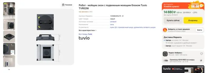 Прямо сейчас робота-мойщика окон Tuvio TVR02W можно купить на Яндекс Маркете за 13 400 рублей по промокоду ND4V46E5 (нужно подписаться на Яндекс Фабрику). А с кэшбеками некоторых банков он обойдётся ещё дешевле.
