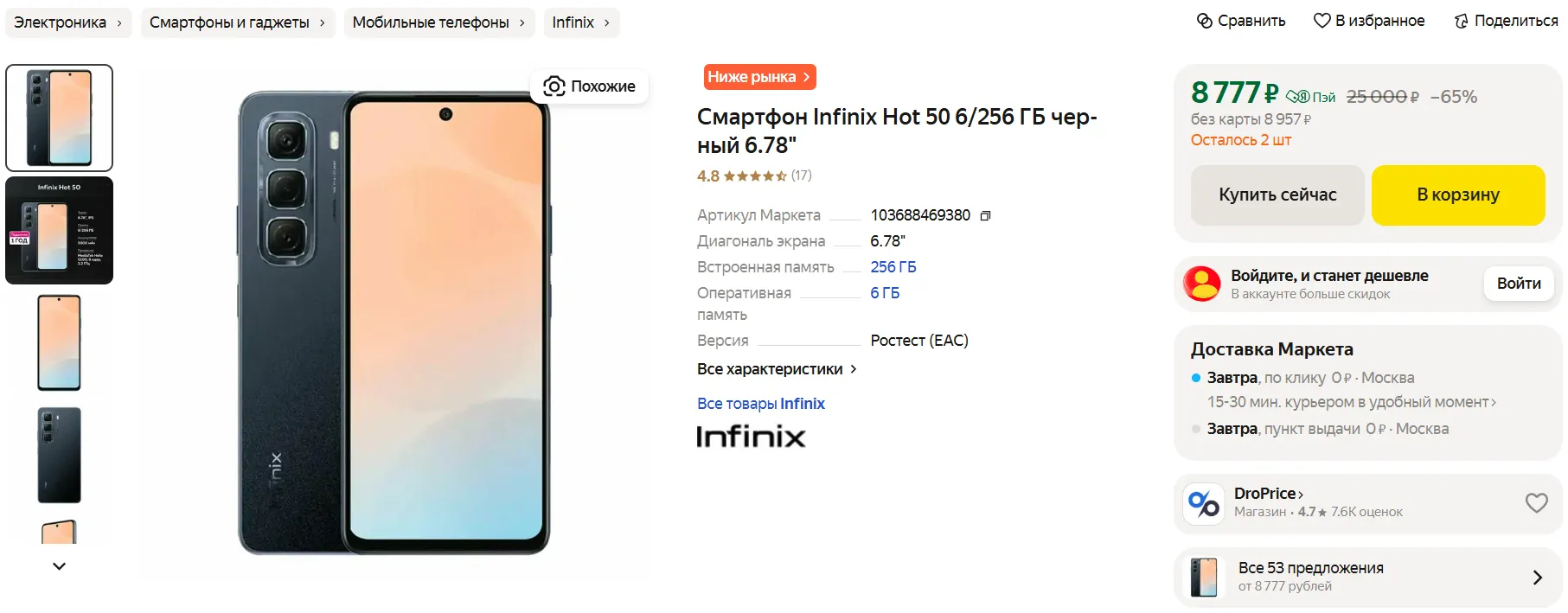 Infinix Hot 50 — достаточно недооцененный, но классный смартфон. Когда-то за него просили минимум 17 тысяч, а сейчас девайс подешевел практически в два раза: на Маркете его отдают за 8 960 рублей.
