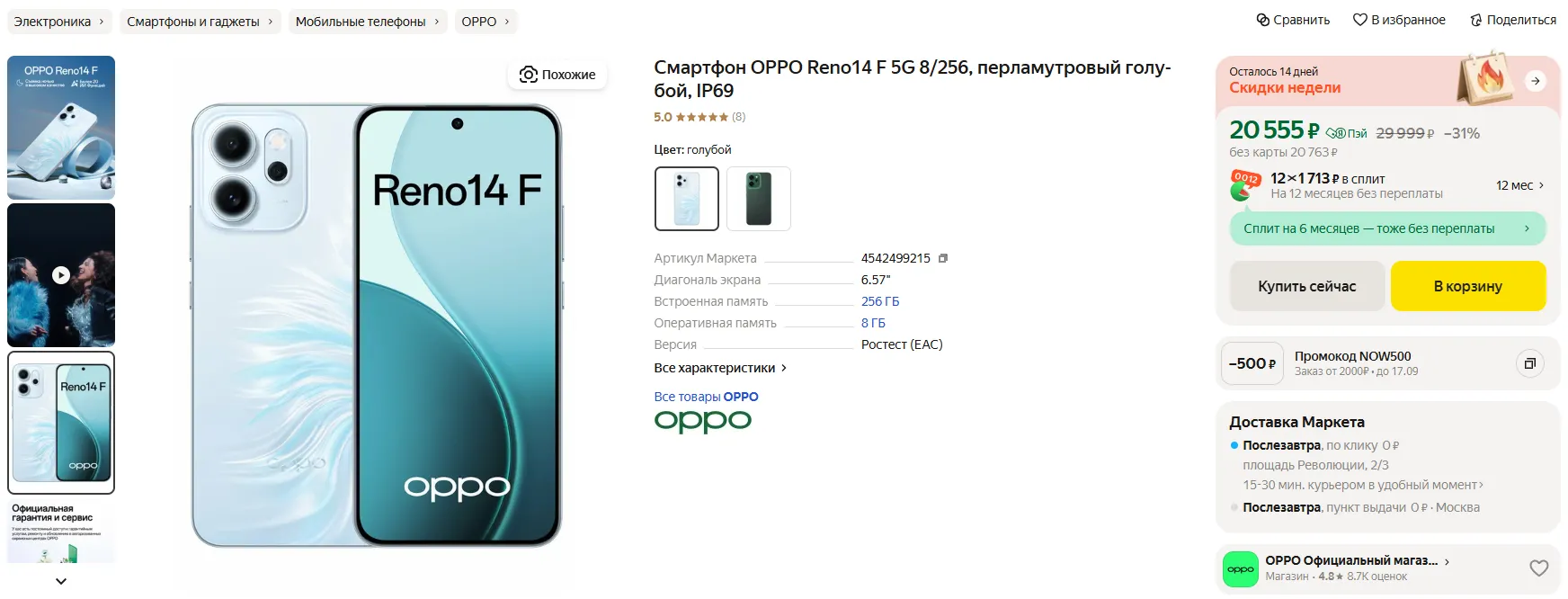 Спустя полгода после релиза «тринашки» Oppo неожиданно выпустила Reno 14F — аппарат стал логичным апгрейдом предшественника и тоже удивил ценником. Например, сейчас за «эфку» просят всего 20 760 рублей на Маркете.