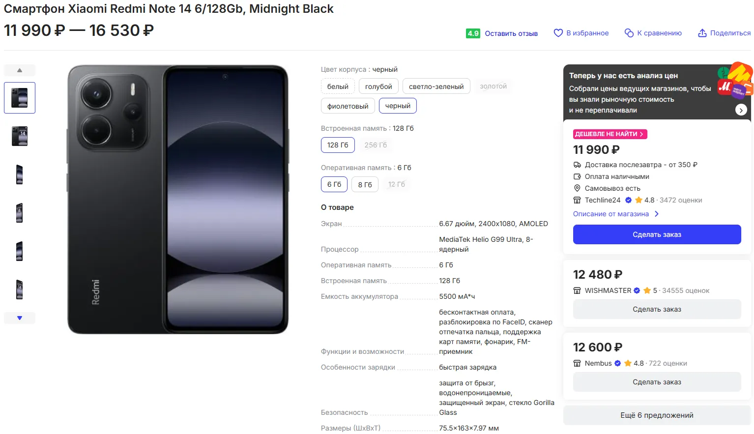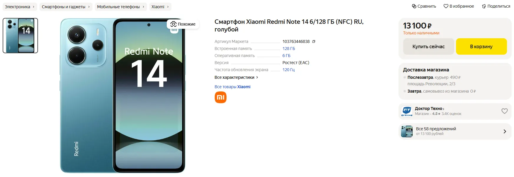 Смущает лишь отсутствие ультраширика — впрочем, и у большинства конкурентов этого объектива нет. Значит, можно не париться и спокойно хватать Redmi Note 14 — на Маркете за бестселлер просят от 13 100 рублей, а на price.ru — минимум 11 990 рублей.