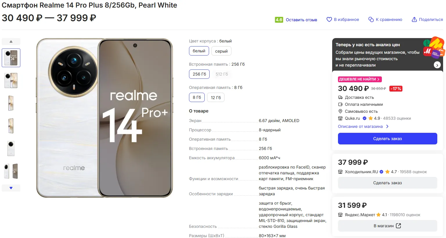30 490 рублей — отличная цена для смартфона с подобными спецификациями. Это безальтернативный вариант для тех, кому нужен недорогой камерофон. Относитесь к таким пользователям? Тогда скорее ныряйте на price.ru — именно на этой площадке Realme 14 Pro+ отдают по лучшему прайсу.