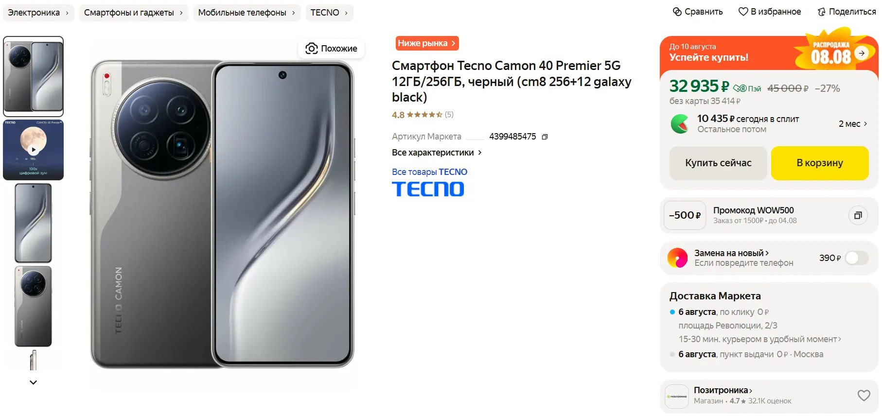 Почему? Просто у него появился конкурент, который круче по большинству спецификаций, так еще и дешевле. Речь про Tecno Camon 40 Premier — сейчас за этот смартфон просят от 35 410 рублей на Маркете.