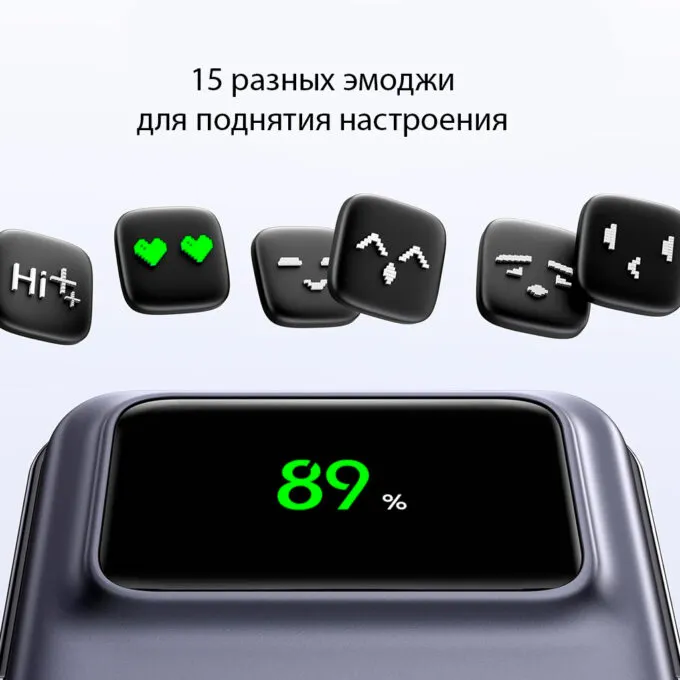 Еще одна фишка — веселый дизайн. Внешний вид пауэрбанка очеловечили: в разных режимах работы на экране появляется разное лицо-эмодзи. В сложенном виде с подставкой кажется, что у этого тамагочи на голове надеты наушники. Виртуальный попутчик покажет, что уровень батареи в норме или наоборот упал, поэтому пора зарядить аккумулятор. Также эмодзи выделят пауэрбанк Ugreen на фоне других аксессуаров.