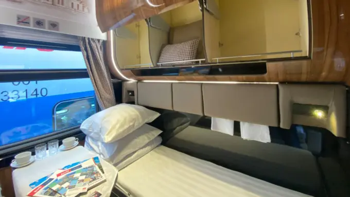Улучшили купейные и штабные вагоны габарита Т. Напомним, что штабной — самый понтовый вагон в двухэтажном поезде (вот его преимущества). Вместо 9 четырехместных купе их стало 10, полки увеличили в длину и ширину, оформили откидные столики даже на верхних местах. А еще в каждом вагоне будут сейфы и беспроводные зарядки — можно будет не доставать провод для своего iPhone.