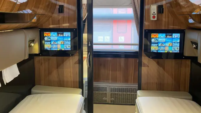 Также в каждом купе разместили мультимедиа-экраны (надеемся, их можно будет отключать на ночь вручную!), новые розетки и USB-зарядки. Кроме того, в каждом вагоне будут душевые с феном и место, где можно погладить одежду.