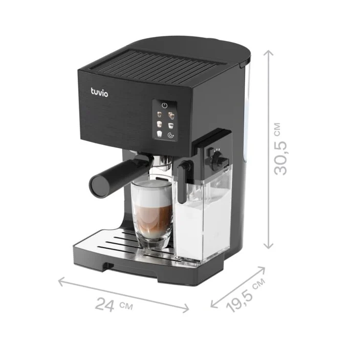 Фронтальную панель Tuvio TCM02EA занимают сенсорные кнопки с программами приготовления напитков. Сбоку размещён съёмный контейнер для молока с регулировкой плотности пенки. Латте, капучино или макиато готовятся в пару нажатий. Для эспрессо предусмотрена откидная платформа — на неё можно ставить маленькие чашки.