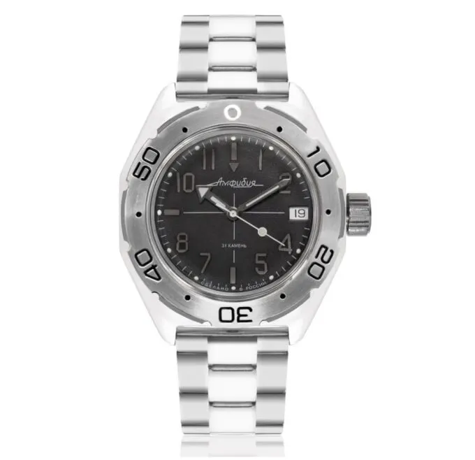 Амфибия 670921 (Steel) — культовые российские часы с автоподзаводом и мощной влагозащитой. Внутри установлен проверенный механизм Восток 2416Б с 31 камнем, автоподзаводом и защитой от перезавода пружины. Также предусмотрена противоударная система и запас хода до 31 часа, что делает модель отличным спутником на каждый день.