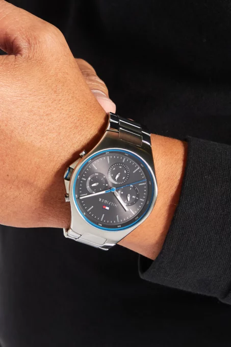 На циферблате Tommy Hilfiger Justin 1792054 расположены дополнительные окна для даты и дня недели. Также предусмотрен переключаемый формат времени 12/24 часа. Сверху это всё прикрыто минеральным стеклом. Разумеется, стальной браслет с раскладывающейся застёжкой тут максимально надёжный. Завершает это комбо влагозащита в 50WR. Дождя, душа и бассейна точно можно не бояться, а вот погружаться в них не стоит.