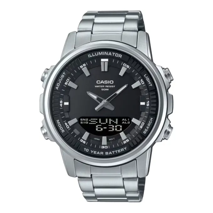 Casio Collection Illuminator AMW-880D-1A — один из самых доступных цифровых хронографов в стальном корпусе. В этой модели сбалансирована классика с необычными фичами по типу встроенной телефонной книги на 30 контактов. Корпус выплавлен из нержавеющей стали, циферблат прикрыт минеральным стеклом, а браслет закрывается тройной раскладывающейся застёжкой. Есть и фирменная подсветка с оранжевым послесвечением, которая помогает считывать показания в темноте, а формат времени можно переключать между 12- и 24-часовым.